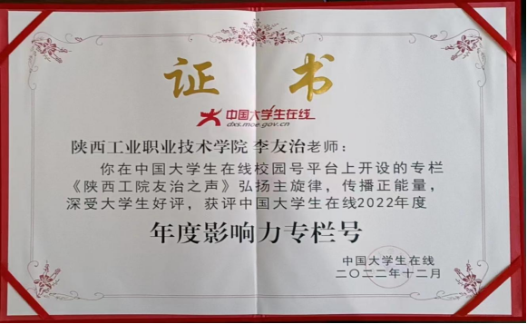 图3 荣获中国大学生在线2022年度影响力专栏号称号证书
