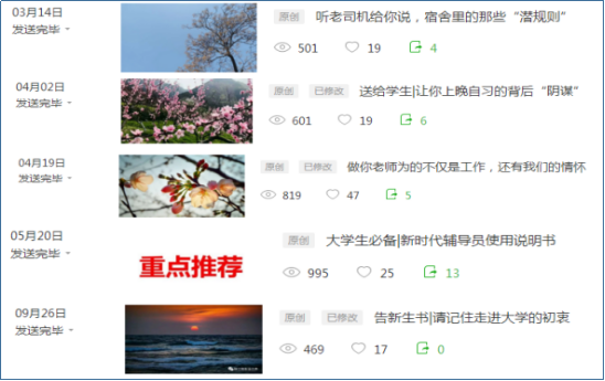 3.师生反馈良好。自运营公众号以来,根据不同的时间节点和学生关注的热点问题以及他们存在的问题,撰写了各种主题网文。截至目前,个人所撰写、推送的164余篇原创网文累积阅读量达4万次以上。同时,部分学生反馈他们非常喜欢公众号推送的内容,并且从中也受到的很大的启发,更为重要的是,该公众号的运营极大地提高个人在学生思政工作方面的效率。此外,个人还受高校辅导员网络培训中心官微编辑邀请,以《做好学生工作从良好的沟通开始》为主题直播,截止目前师生观看人数达1.3万余人。同时,很多学生反馈从相关推文中受到积极的启发。