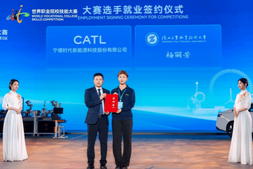 现场签约环节共邀请了来自全国9所职业院校的9名大赛获奖学生和9家行业领军企业现场签署就业协议。应大赛组委会邀请,我校汽车工程学院新能源汽车技术专业2304班学生杨丽芳与宁德时代新能源科技股份有限公司运营中心主任工程师韩红攀进行现场签约,我校刘清副校长进行现场见证。此次签约进一步将技能竞赛与就业发展紧密结合,实现了从赛场到职场的直通对接,为技能人才搭建了高质量就业渠道。