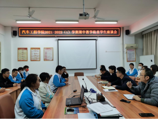根据学院关于期中教学检查工作的相关安排,11月15日下午,汽车学院组织召开了学生座谈会。学院党总支书记高亚宁、副院长许冀阳、学工办主任王禹程、实训中心主任朱辉、全体辅导员以及各年级学生代表30余人参加了座谈会。