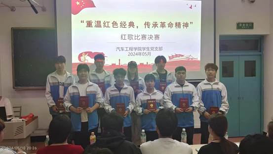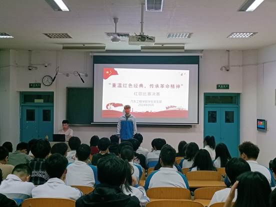 为了弘扬革命精神,激发学生爱党爱国热情,用红色文化影响学生、感染学生、激励学生,增强青年学生感党恩、听党话、跟党走的信心和决心,2024年5月13日晚自习,汽车工程学院学生党支部举办第一届“传唱红色经典,传承革命精神”红歌大赛。