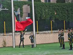 6点50分,国旗护卫队精神抖擞迈着整齐划一的步伐护送鲜艳的五星红旗入场,五星红旗伴随着雄壮的国歌徐徐升起,全体师生面向国旗行注目礼。