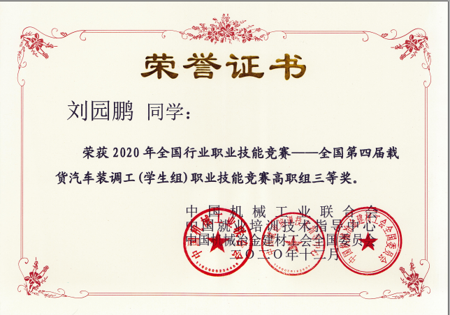 2020年12月3日,由中国机械工业联合会、中国就业培训技术指导中心、中国机械冶金建材工会全国委员会共同主办,机械工业职业技能鉴定指导中心、陕西天益教育科技有限公司、陕西交通职业技术学院、陕西汽车集团职工培训大学共同承办的“2020年全国行业职业技能竞赛--全国第四届载货汽车装调工(学生组)职业技能竞赛”,全国决赛经过两天紧张激烈的角逐,顺利完成了各项赛程,今天圆满收官。来自全国各地的选手同台竞技、各展风采,既交流了技术、切磋了技艺,同时也展示了各参赛队良好的精神风貌。我院由汽车工程学院刘波、郭炎伟两位老师指导的邰清华、刘园鹏二位选手代表参赛。经过紧张激烈的角逐,最终邰清华荣获高职组个人赛二等奖,刘园鹏荣获三等奖,汽车工程学院教师郭炎伟获“优秀指导老师”奖。