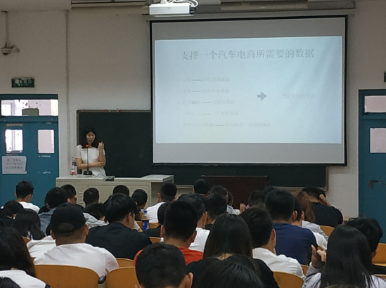 报告中,王舒颜经理以自己从北京到美国的求学经历引入,着重从汽车电商的大数据(真车网为例)、汽车行业里的四个角色(4S店、厂商、第三方、顾客)、大数据行业的其他常见数据应用等三方面内容与全体学生进行了分享。最后,王舒颜经理还就学生提出的一些有关汽车行业的问题现场进行了解答,并勉励大家要利用好专业优势,抓住新时代机遇,为实现自我价值不懈奋斗,为民族复兴铺路架桥,为祖国建设添砖加瓦。